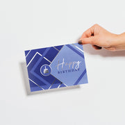 A blue and silver geometric design with a cute little cake makes for the perfect business birthday card. Card available as a 5" x 7" greeting card with white mailing envelope.
