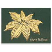 A classic gold embossed poinsettia pops against a bold green background. All of our greeting cards can be personalized on the inside with hot stamped foil imprinting.
