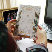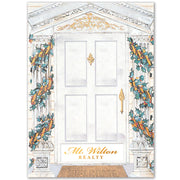 A formal doorway flanked by two garland-wrapped columns sets an elegant stage for your personalized greeting. The die cut window showcases your company name on the inside of the card. All of our greeting cards can be personalized on the inside with hot stamped foil imprinting.
