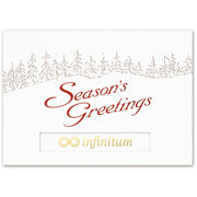 Evoke the spirit of the holiday season with this beautifully designed card! Your company name is showcased in a die-cut window below a sweeping, snowy hillside of embossed iridescent evergreen trees.