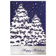 Two snow-flocked evergreen trees set a peaceful scene against snowflakes and a dark winter sky. This holiday card has an embossed and foil stamped design.