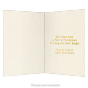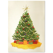 A simplistic scene of a decorated Christmas tree with piles of presents underneath evokes a warm Christmas morning feeling. All of our greeting cards can be personalized on the inside with hot stamped foil imprinting.