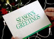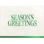 A classic "Season's Greetings" in a nice holographic green foil is perfect for the Christmas season. Embossed snowflakes on pearlescent paper make this card really shimmer. All of our greeting cards can be personalized on the inside with hot stamped foil imprinting.