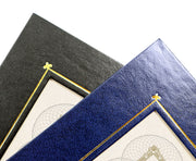 Available in blue or black with a decorative gold window border, this heavy-duty, glossy leatherette wrapped edge chipboard (cardboard) frame features a pop-out easel back to display horizontally or vertically, as well as two tabs for wall hanging.