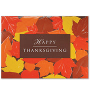 Designed in rich autumn colors, this Thanksgiving card beautifully evokes the feeling of fall. Embossed leaves in orange, gold, red and brown create a simple background for a modern and yet elegant "Happy Thanksgiving" greeting. Inside greeting is stamped in Copper foil.