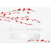 Beautiful, modern red holographic and silver foil berry branches highlight the die cut window showing your company name.