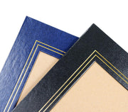 Available in blue or black with a decorative gold window border, this heavy-duty, glossy leatherette wrapped edge chipboard (cardboard) frame features a pop-out easel back to display horizontally or vertically, as well as two tabs for wall hanging.
